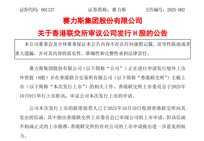 来自重庆的A股上市公司赛力斯(601127.SH)于周五(10月10日)发布公告,公布公司申请香港上市的进展,香港联交所上市委员会于2025年10月9日举行上市聆讯,审议公司本次发行上市的申请。